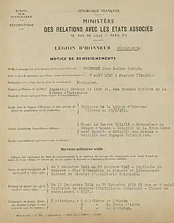 Remerciements de Charles de Gaulle, le , à la fin de la guerre pour son implication dans les Forces françaises libres: “Répondant à l’appel de la France en péril de mort, vous avez rallié les Forces Françaises Libres. Vous avez été de l'équipe volontaire des bons Compagnons qui ont maintenu notre pays dans la guerre et dans l’honneur. Vous avez été de ceux qui, au premier rang, lui ont permis de remporter la Victoire! Au moment où le but est atteint, je tiens à vous remercier amicalement, simplement, au nom de la France.”