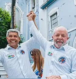 Son colistier et candidat en tant que vice-gouverneur est Geraldo Júnior (MDB), vice-président sortant du Conseil municipal de Salvador[6]. À l'issue du premier tour, il est en tête avec 4 019 830 voix mais ne parvient pas à être élu au premier tour[7], une première depuis 1994 et contrairement à ses prédécesseurs du PT. Lors de la campagne du second tour pour l'élection du gouverneur et pour l'élection présidentielle, Lula participe à un meeting pour soutenir Jerônimo Rodrigues, accompagné du gouverneur Rui Costa[8].