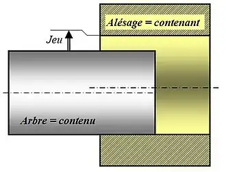 - avec jeu (positif) : la pièce contenant est, dans l'absolu, plus grande que la pièce contenue, et le montage est alors possible. C'est le cas du tiroir de commode, ou plus précisément d'un piston de moteur dans sa chemise.