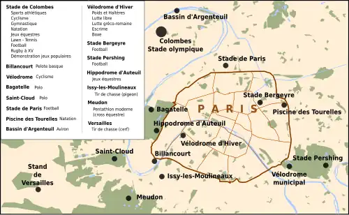 Pour les épreuves de natation, la piscine des Tourelles est construite. C'est le premier bassin de 50 m à couloirs séparés par des lignes de bouchons en liège. Les épreuves de tir se tiennent à Reims, dans un bâtiment construit pour l'occasion[5]. M. Thomasson, architecte de l'Union des sociétés de tir de France, signe les plans de ce bâtiment. Les épreuves de tir de chasse (cerf) se déroulent au stand du Tir national de Versailles. Les épreuves d'équitation se déroulent à l'hippodrome d'Auteuil, le vélodrome d'Hiver accueille la boxe, la lutte et l'haltérophilie, le vélodrome de Vincennes le cyclisme sur piste, le bassin d'Argenteuil l'aviron. Les matchs de football se déroulent au stade Pershing, au stade Bergeyre et au stade de Paris à Saint-Ouen, les régates de voile à Meulan et au Havre. Les sites de Versailles, Saint-Cloud, Bagatelle, Boulogne-Billancourt, Issy-les-Moulineaux et Meudon sont également choisis par le comité d'organisation pour accueillir les différentes disciplines au programme.