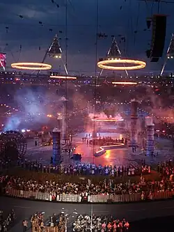 La cérémonie d'ouverture des Jeux olympiques de Londres débute le [21] à partir de 21 h, heure locale, pour se terminer vers 1 h, heure locale[22]. L'organisation de la cérémonie d'ouverture est confiée au réalisateur Danny Boyle[23]. La vasque olympique est allumée par sept jeunes athlètes britanniques après avoir reçu la flamme des mains de Steve Redgrave[24], le sportif anglais avec le plus beau palmarès. La vasque était originale cette année car elle était composée de plusieurs pétales qui se sont réunis en bouquet de fleurs. La cérémonie rassemble des personnalités aussi diverses que l'humoriste Rowan Atkinson, le footballeur David Beckham, les acteurs Kenneth Branagh et Daniel Craig, le chanteur Paul McCartney et l'écrivaine J. K. Rowling.