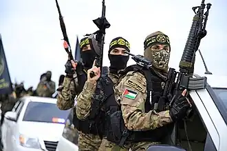- 7 octobre 2023 : Aux côtés des autres forces armées palestiniennes, attaque en territoire israélien. En une seule journée, plus de 350 soldats et policiers israéliens et plus de 760 civils israéliens sont tués, dans les villes voisines, les kibboutz, les bases militaires et lors d'un festival de musique près de Réïm[32],[33],[34]. Environ 200 civils et soldats israéliens sont capturés afin de les échanger contre des prisonniers palestiniens et sont détenus dans la bande de Gaza, dont une quarantaine d'enfants[35],[33],[36],[37]. Ce même jour, entre 2 500 et 5 000 roquettes sont tirées contre Israël[38],[36].