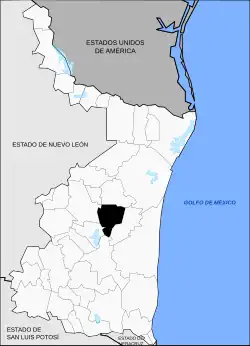 Elle est limitrophe au nord des municipalités de Cruillas et de San Nicolás, à l'ouest de celles de San Carlos et de Padilla, au sud de celle de Casas, et à l'est de celle d'Abasolo[5].