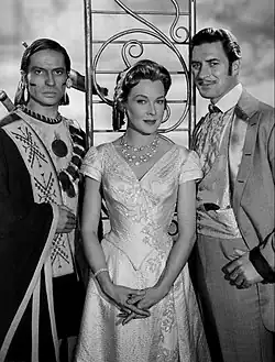 De g. à d. : X Brands (en), Frances Bergen et Jock Mahoney, dans la série Yancy Derringer (en) (photo promotionnelle, 1959)