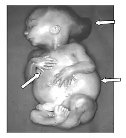 Syndrome de Meckel, les flèches indiquent les doigts surnuméraires (polydactylie), une hernie du cerveau (encéphalocèle occipitale), et une maladie polykystique du rein et autres viscères.