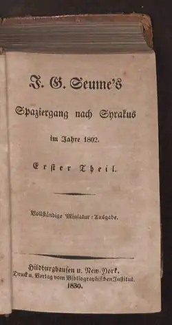 - Spaziergang nach Syrakus im Jahre 1802, von J. G. Seume... 2te verbesserte Auflage..., Braunschweig und Leipzig, 1805 (réédité Leipzig, F. A. Brockhaus, 1868, et Frankfurt am Main, Insel, 2002).
