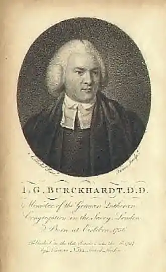 Johann Gottlieb Burckhardt (Eisleben, 1756-Hotwells (en), 1800) est un universitaire saxon, maître de conférences à l'Université de Leipzig à partir de 1780, mais qui choisit de quitter le territoire saxon pour devenir pasteur à l'église St. Mary in the Savoy[1], la plus grande des paroisses luthériennes germanophones de la capitale britannique de l'époque.