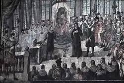 - Bildgalerie mit vergrößerbaren Fotos des Wandgemäldes Luther auf dem Reichstag zu Worms, von Johann Martin und Johann Ludwig Seekatz, Wandgemälde aus der Dreifaltigkeitskirche Worms, vor der Zerstörung 1944