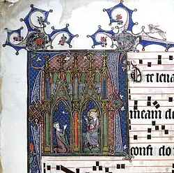 Les bordures avec drôleries, et scènes animales naturalistes, végétales ou toutes sortes d'oiseaux, animaux ou personnages zoomorphes sont très fréquentes. On trouve notamment le thème fréquent déjà dans les enluminures parisiennes, des chiens de chasse poursuivant des lapins, des dragons ailés, enroulés autour de branches ou cachés dans des bourgeons, et le thème du chasseur tirant une flèche en direction d'un animal qui se trouve à belle distance, à moitié de feuille[17]. Les enluminures des initiales ne couvrent, selon le mode en vogue à Paris, qu'un tiers de la largeur d'un page, mais elles sont déjà en général entourées de cadres carrés. Les fonds sont décorés de motifs tapissés, et la feuille d'or est souvent délaissée au profit de couleurs plus vives, le minium, bleu, vert, violet, gris, beige, blanc[18]. Les thèmes des initiales sont :