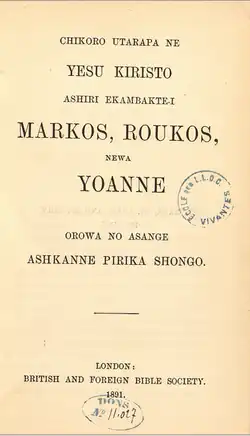 - 1891, Chikoro Utarapa ne Yesu Kiristo ashiri ekambakte-i Markos, Roukos, newa Yoanine orowa no asange ashkanne pirika shongo (The New Promise of Our Lord Jesus Christ, the Pure Good News Handed Down to us from Mark, Luke, and John), Londres.