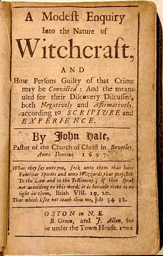 - ↑ (en) John Hale, A Modest Enquiry Into the Nature of Witchcraft, Massachusetts, États-Unis, Benjamin Elliot, (lire en ligne) Ouvrage numérisé mis en ligne en 2000 par l'université de Virginie