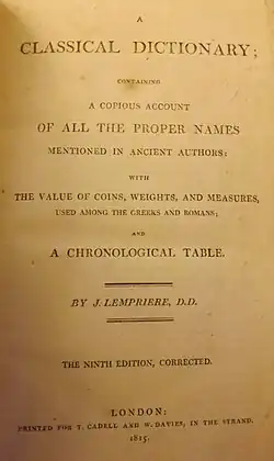 (en) « John Lemprière », dans Encyclopædia Britannica , (lire sur Wikisource).- (en) A Dictionary of Universal Biography of All Ages and of All Peoples, Albert M. Hyamson, 1916