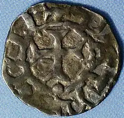 - droit typiquement régalien, il a battu monnaie, dont on connaît une émission dédiée à saint Patrick, et une autre à son nom, frappées à Carrickfergus et Down. Il s'y présente même comme le roi d'Ulster[43]. C'est d'ailleurs le titre que lui donnera Jean sans Terre quand il lancera un mandat d'arrêt contre lui : Rex omnibus baronibus Ultoniæ[44].