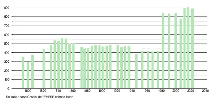 L'évolution du nombre d'habitants est connue à travers les recensements de la population effectués dans la commune depuis 1793. Pour les communes de moins de 10 000 habitants, une enquête de recensement portant sur toute la population est réalisée tous les cinq ans, les populations de référence des années intermédiaires étant quant à elles estimées par interpolation ou extrapolation[32]. Pour la commune, le premier recensement exhaustif entrant dans le cadre du nouveau dispositif a été réalisé en 2006[33].