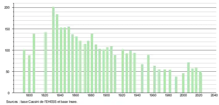 L'évolution du nombre d'habitants est connue à travers les recensements de la population effectués dans la commune depuis 1793. Pour les communes de moins de 10 000 habitants, une enquête de recensement portant sur toute la population est réalisée tous les cinq ans, les populations de référence des années intermédiaires étant quant à elles estimées par interpolation ou extrapolation[25]. Pour la commune, le premier recensement exhaustif entrant dans le cadre du nouveau dispositif a été réalisé en 2006[26].