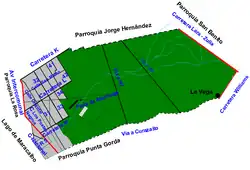 La partie occidentale de la paroisse civile est quadrillée par la trame viaire de la ville de Cabimas : du nord au sud par les carreteras K, L et M et l'ouest en est par les calles Nacional, Los Postes Negros, Oriental, puis par les avenidas 31 à 42.