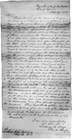 - ↑ Entretien entre Thomas Ford, gouverneur d'Illinois, et Joseph Smith.