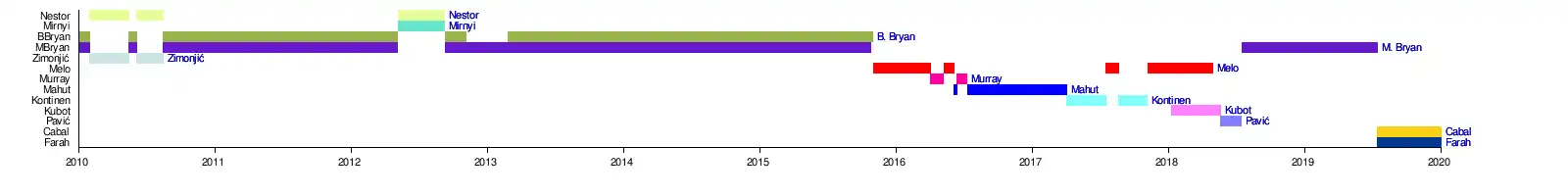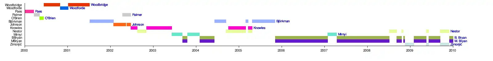 Les frères jumeaux Bob et Mike Bryan ont occupé la tête du classement ATP en double. Durant 438 semaines, ils ont occupé cette place ensemble.