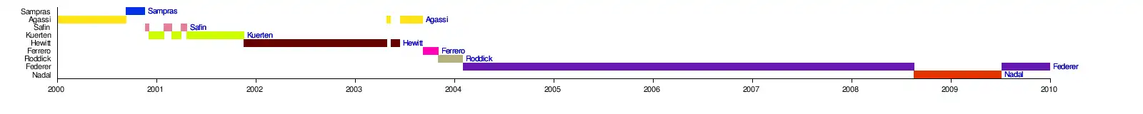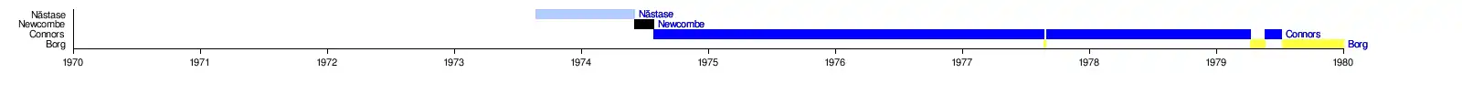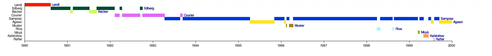 Depuis 1973 et la création du classement ATP, à douze reprises un joueur a occupé la place de no 1 durant toute une année calendaire. À l'inverse, 1999 est l'année qui a vu le plus grand nombre de joueurs se succéder à la tête du classement : cinq joueurs furent no 1 cette année-là (Sampras, Carlos Moyà, Ievgueni Kafelnikov, Agassi et Rafter).
