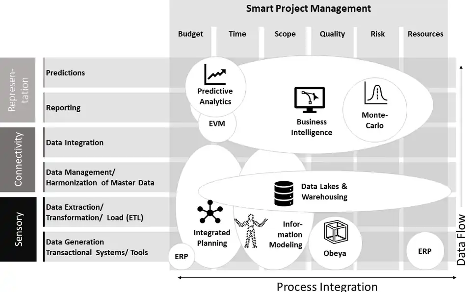 La prise de décisions tactiques peut non seulement prévenir les problèmes potentiels à l’avance, mais aussi permettre aux équipes d’adapter les processus en fonction de l’évolution des conditions[5]. La gestion de la valeur acquise (Earned Value Management), pour évaluer l’avancement réel (physique et financier), associée avec une analyse prédictive partir de l’historique des données ou des méthodes de Monte Carlo pour les simulations sont quelques techniques qui peuvent être utilisées pour une représentation virtuelle du projet. Des outils d’analyse de données simples d’utilisation sont souvent combinés à des indicateurs et rapports en temps réel au sein d’outils d’aide à la décision.
