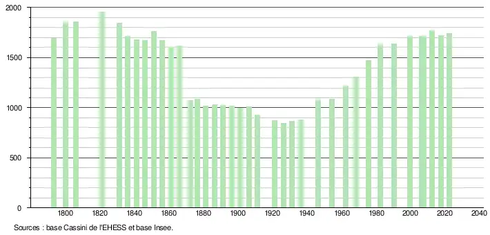 L'évolution du nombre d'habitants est connue à travers les recensements de la population effectués dans la commune depuis 1793. Pour les communes de moins de 10 000 habitants, une enquête de recensement portant sur toute la population est réalisée tous les cinq ans, les populations de référence des années intermédiaires étant quant à elles estimées par interpolation ou extrapolation[27]. Pour la commune, le premier recensement exhaustif entrant dans le cadre du nouveau dispositif a été réalisé en 2007[28].