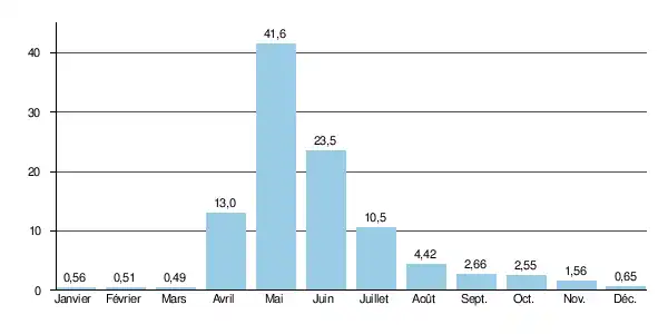 Les hautes eaux se déroulent au printemps, de fin avril à fin juin, ce qui correspond au dégel et à la fonte des neiges. Au mois de juin puis de juillet, le débit baisse fortement, puis poursuit sa décroissance tout au long du reste de l'été et de l'automne. Au mois de décembre, le débit de la rivière plonge à nouveau, ce qui constitue le début de la période des basses eaux. Celle-ci a lieu de décembre à mars inclus et correspond aux gels de l'hiver qui envahissent toute la région.