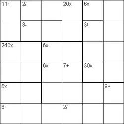 La grille est constituée d'un nombre égal de lignes et de colonnes contenant des blocs de deux ou trois cases délimitées par un épais trait noir. Le chiffre inscrit en haut à gauche de chaque bloc est le résultat de l'opération (addition, soustraction, multiplication, division) effectuée avec les chiffres des deux ou trois cases d'un même bloc.