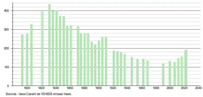L'évolution du nombre d'habitants est connue à travers les recensements de la population effectués dans la commune depuis 1793. Pour les communes de moins de 10 000 habitants, une enquête de recensement portant sur toute la population est réalisée tous les cinq ans, les populations de référence des années intermédiaires étant quant à elles estimées par interpolation ou extrapolation[18]. Pour la commune, le premier recensement exhaustif entrant dans le cadre du nouveau dispositif a été réalisé en 2006[19].