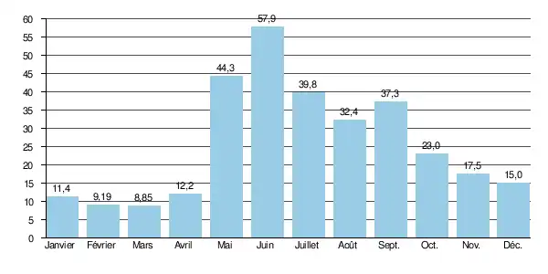 En ce qui concerne la période estivale, libre de glaces (de mai à septembre inclus), le débit mensuel minimal observé a été de 14,3 m3/s en , niveau restant encore fort appréciable.