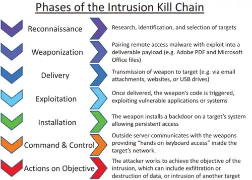 La « kill chain d'intrusion » décrit les phases d'une cyberattaque, de la reconnaissance à l'exfiltration de données[4]. Celle-ci peut également être utilisée comme outil de gestion, afin d'améliorer en permanence la défense du réseau. Selon Lockheed Martin, les menaces doivent passer par plusieurs phases du modèle, parmi lesquelles :