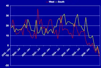 Variation du prix des appartements en % dans le Sud et l'Ouest des États-Unis durant la période 2002-2006 (source: NAR.) - ↑ This article classified several U.S. real-estate regions as "Dead Zones", "Danger Zones", and "Safe Havens."