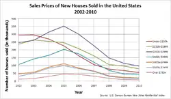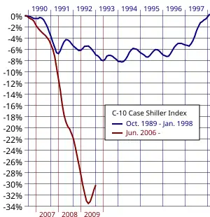 Évolution des prix immobiliers ajustés de l'inflation dans de nombreuses cités américaines 1990–2005. - ↑ (en) « Bubble, Bubble — Then Trouble: Is the chill in once-red-hot Loudoun County, Va., a portent of what's ahead? », Business Week, (lire en ligne).