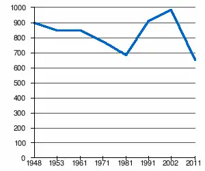 | 897 | 853 | 848 | 776 | 682 | 910 | 986[2] | 653[1] |