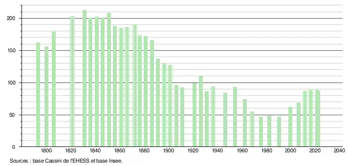L'évolution du nombre d'habitants est connue à travers les recensements de la population effectués dans la commune depuis 1793. Pour les communes de moins de 10 000 habitants, une enquête de recensement portant sur toute la population est réalisée tous les cinq ans, les populations de référence des années intermédiaires étant quant à elles estimées par interpolation ou extrapolation[27]. Pour la commune, le premier recensement exhaustif entrant dans le cadre du nouveau dispositif a été réalisé en 2006[28].
