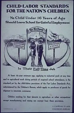 Aux États-Unis, la législation sur le travail des enfants réglemente l'emploi et la sécurité des enfants au travail. Au niveau fédéral, l'évolution législative la plus importante pour limiter l'emploi et l'exploitation des travailleurs mineurs est le Fair Labor Standards Act de 1938 (FLSA)[1]. Les conditions permettant le travail des enfants selon le FLSA visent à protéger les possibilités d'instruction des jeunes et interdisent de les recruter dans des emplois qui portent atteinte à leur santé et à leur sécurité. Le FLSA indique les horaires maximaux de travail pour les jeunes de moins de 16 ans et détaille divers métiers risqués, trop dangereux pour être confiés à des enfants.