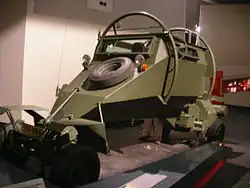 | Blindage | Marques initiales : plaque d'acier doux avec bande transporteuse prise en sandwich entre les deux, marques ultérieures ; (coque inférieure) : plaque d'acier « Bennox » de 12 mm, (coque supérieure) : plaque d'acier doux. (Le blindage était principalement destiné à protéger contre les explosions de mines terrestres et offrait une résistance limitée aux tirs d'armes légères). |