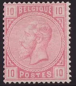 Roi à la mort de son père Léopold Ier en 1865, le premier timbre à son effigie est émis le , il s'agit du 10 centimes vert. Les cinq émissions imprimées en typographie le montrent de profil gauche uniquement, dans une grande variété de cadres et de médaillons.