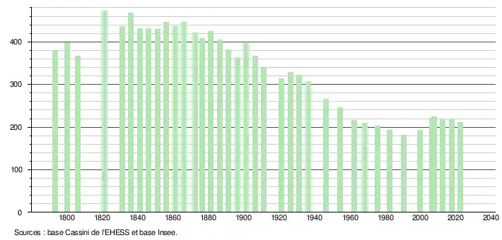 L'évolution du nombre d'habitants est connue à travers les recensements de la population effectués dans la commune depuis 1793. Pour les communes de moins de 10 000 habitants, une enquête de recensement portant sur toute la population est réalisée tous les cinq ans, les populations de référence des années intermédiaires étant quant à elles estimées par interpolation ou extrapolation[39]. Pour la commune, le premier recensement exhaustif entrant dans le cadre du nouveau dispositif a été réalisé en 2007[40].