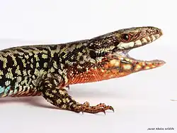 « Les os de leurs mâchoires sont réunis par une articulation, ce qui limite les possibilités d'ouverture et ne permet pas aux lézards d'avaler des proies démesurées par rapport à leur taille, comme le font de façon spectaculaire les serpents »[11]. Ses nombreuses dents sont trop petites pour mâcher les proies qu'il avale entières[12]. Elles servent donc seulement à la capture des proies, et à éviter leur retrait, comme les dents d'un harpon.
