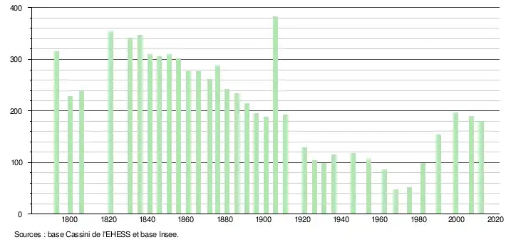 - ↑ Par convention dans Wikipédia, le principe a été retenu de n’afficher dans le tableau des recensements et le graphique, pour les populations légales postérieures à 1999, que les populations correspondant à une enquête exhaustive de recensement pour les communes de moins de 10 000 habitants, et que les populations des années 2006, 2011, 2016, etc. pour les communes de plus de 10 000 habitants, ainsi que la dernière population légale publiée par l’Insee pour l'ensemble des communes.