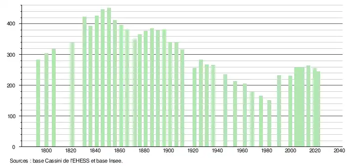 L'évolution du nombre d'habitants est connue à travers les recensements de la population effectués dans la commune depuis 1793. Pour les communes de moins de 10 000 habitants, une enquête de recensement portant sur toute la population est réalisée tous les cinq ans, les populations de référence des années intermédiaires étant quant à elles estimées par interpolation ou extrapolation[27]. Pour la commune, le premier recensement exhaustif entrant dans le cadre du nouveau dispositif a été réalisé en 2004[28].