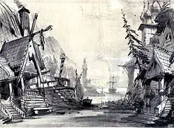 Une place de village aux environs de Vyborg, sur les bords du golfe de Finlande. À gauche, la maison rustique de George Skawronski à laquelle on accède par un escalier extérieur. À droite, l’entrée de l’église. Au fond, des rochers et à l’horizon, le golfe de Finlande.