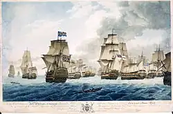 L'Achille (à gauche) démâté par le HMS Brunswick lors de la bataille de Prairial.