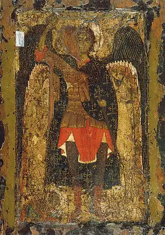 Les coloris sont vifs, joyeux et typiquement russes. Les différents ocres s'accordent harmonieusement entre eux ainsi qu'aux teintes bleues, mauves et vermillon. Les ailes, l'armure, la cape sont relevées d'assists. Elles augmentent la solennité et la spiritualité d'un personnage sévère[7]. Victor Lazarev n'exclut pas le rattachement de l'icône à l'école de Moscou encore naissante au milieu du XIIIe siècle mais la rattache également à la tradition du XIIe siècle [8].