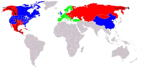 En bleu : Les États-Unis et leurs alliés le Canada, le Royaume-Uni et la République populaire de Chine.