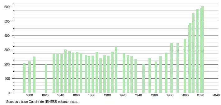 L'évolution du nombre d'habitants est connue à travers les recensements de la population effectués dans la commune depuis 1793. Pour les communes de moins de 10 000 habitants, une enquête de recensement portant sur toute la population est réalisée tous les cinq ans, les populations de référence des années intermédiaires étant quant à elles estimées par interpolation ou extrapolation[19]. Pour la commune, le premier recensement exhaustif entrant dans le cadre du nouveau dispositif a été réalisé en 2005[20].