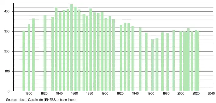 L'évolution du nombre d'habitants est connue à travers les recensements de la population effectués dans la commune depuis 1793. Pour les communes de moins de 10 000 habitants, une enquête de recensement portant sur toute la population est réalisée tous les cinq ans, les populations de référence des années intermédiaires étant quant à elles estimées par interpolation ou extrapolation[17]. Pour la commune, le premier recensement exhaustif entrant dans le cadre du nouveau dispositif a été réalisé en 2004[18].
