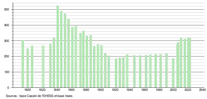 L'évolution du nombre d'habitants est connue à travers les recensements de la population effectués dans la commune depuis 1793. Pour les communes de moins de 10 000 habitants, une enquête de recensement portant sur toute la population est réalisée tous les cinq ans, les populations de référence des années intermédiaires étant quant à elles estimées par interpolation ou extrapolation[27]. Pour la commune, le premier recensement exhaustif entrant dans le cadre du nouveau dispositif a été réalisé en 2005[28].