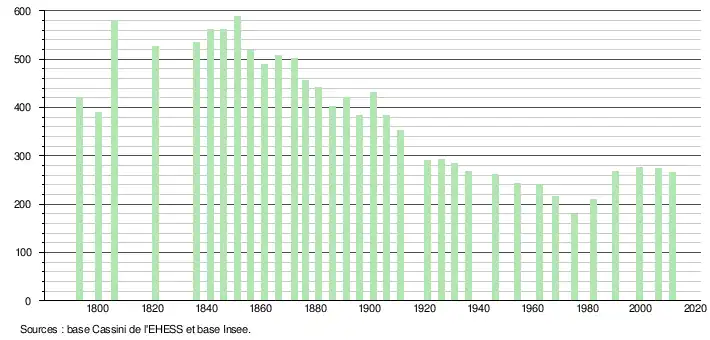 - ↑ Dans le tableau des recensements et le graphique, par convention dans Wikipédia, le principe a été retenu, pour les populations légales postérieures à 1999 de n’afficher dans le tableau des recensements et le graphique que les populations correspondant à l'année 2006, première population légale publiée calculée conformément aux concepts définis dans le décret no 2003-485 du 5 juin 2003, et les années correspondant à une enquête exhaustive de recensement pour les communes de moins de 10 000 habitants, ainsi que la dernière population légale publiée par l’Insee.
