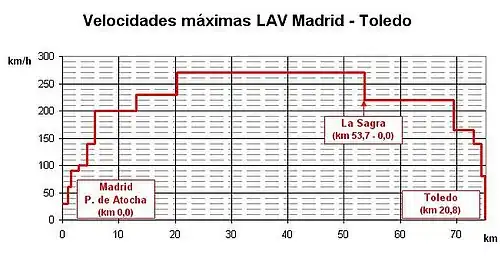 Le tronc commun de 54 km Madrid - La Sagra été conçu pour que les trains puissent y circuler à une vitesse maximum de 270 km/h tandis que le second tronçon de 21 km La Sagra - Tolède admet une vitesse maximale de 220 km/h[1].
